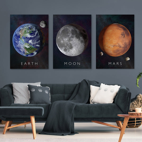 Bring the solar system to life on the walls of your home. Durable, A1 prints of the Earth, Moon, Mars and the solar system as a whole. View them through the free app and watch the planets come to life with facts, figures, detailed information and cross sections!